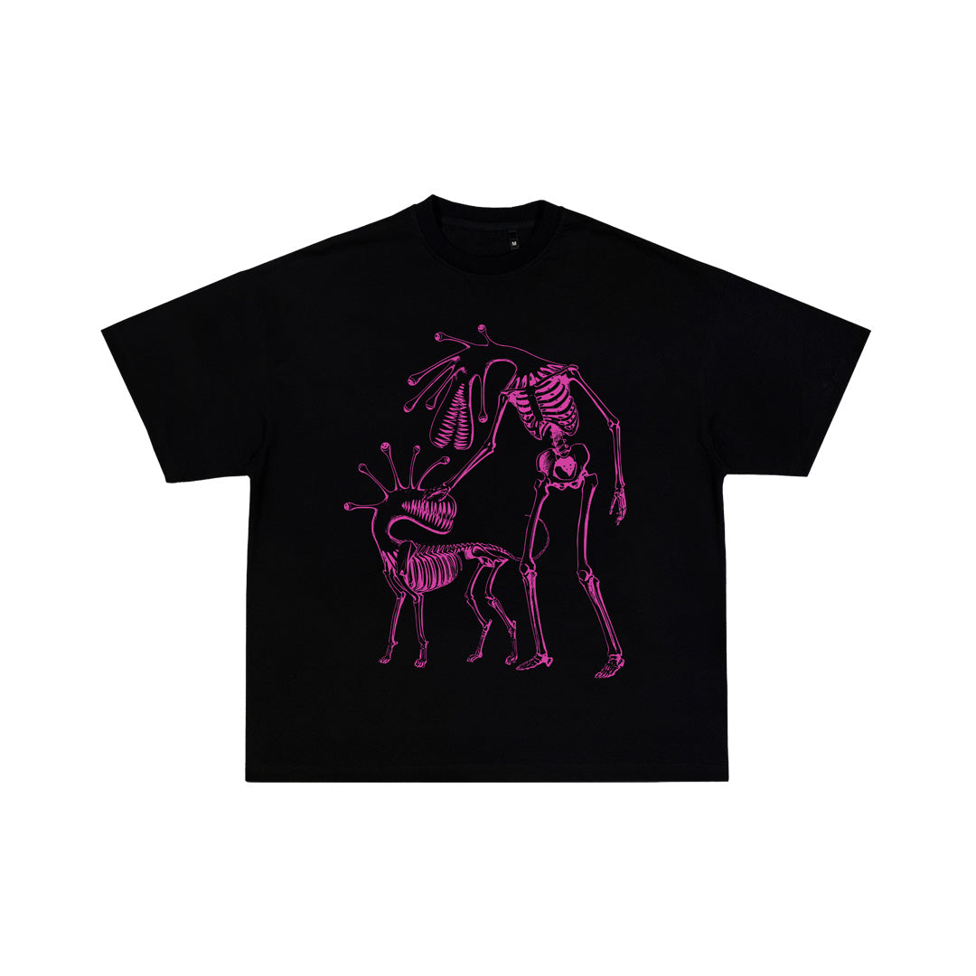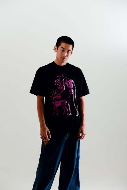 IRONY is a black garment dyed tee with graphic art inspired by Hitoshi Iwaaki's Parasyte manga.