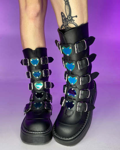 2" (51mm) Platform Mid-Calf Boot Featuring 5 Buckle Straps w/ Colorful Plating Heart Shaped Metal Plates at Center, Back Metal Zip Closure