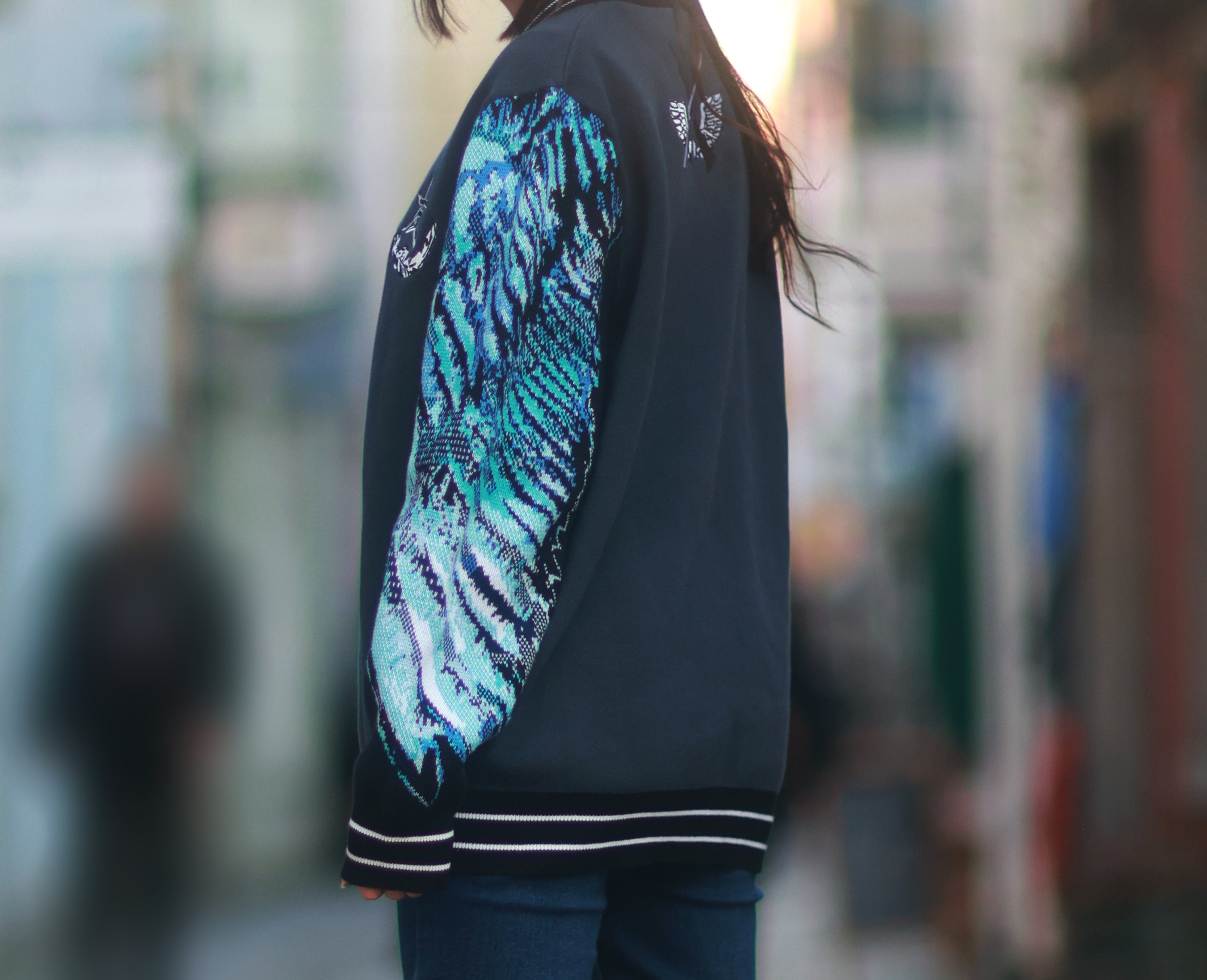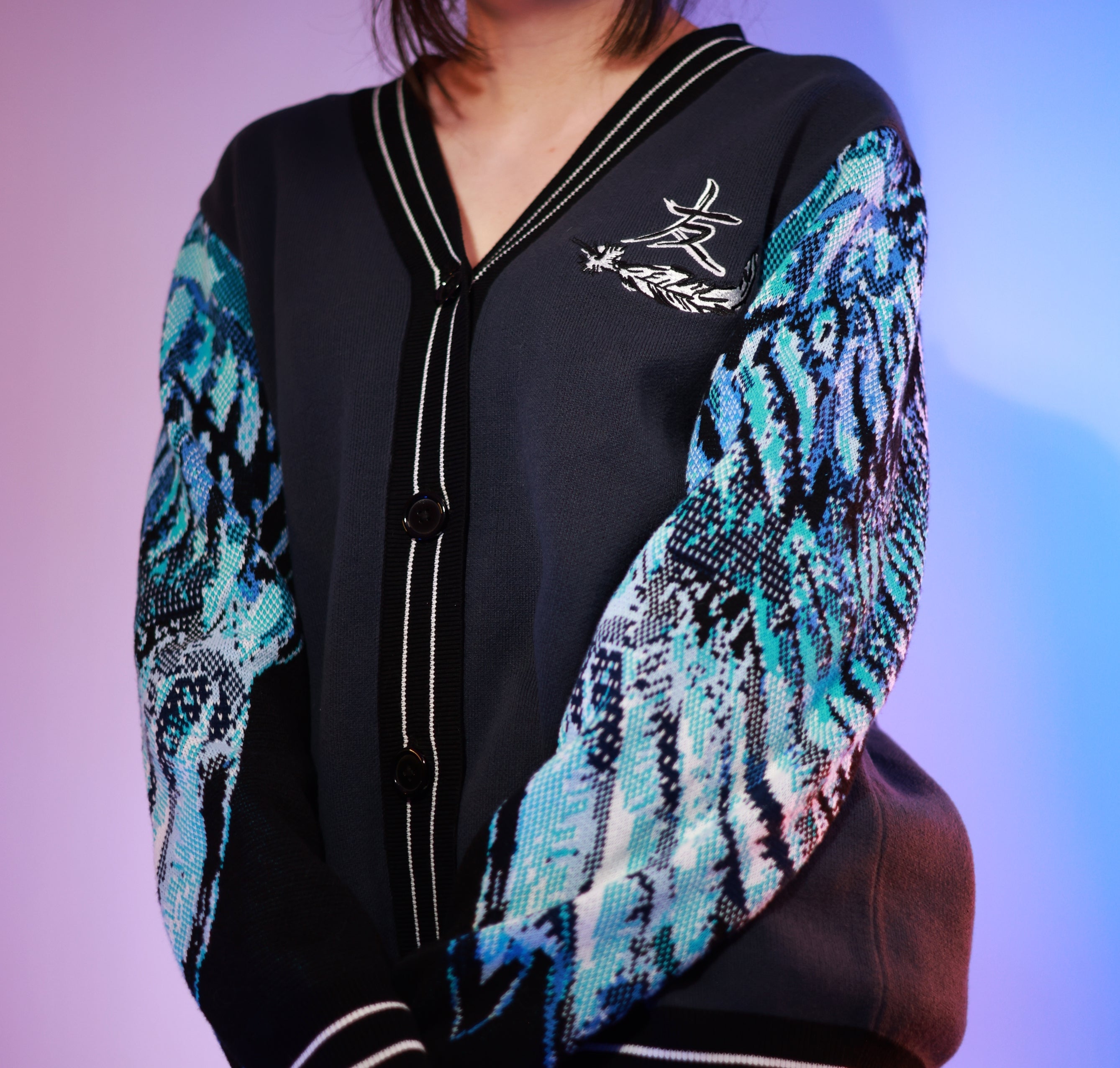 - The cardigan has a colorful jacquard wing pattern on the sleeves