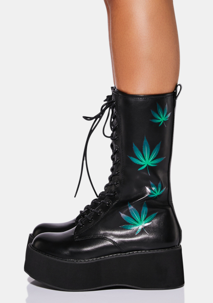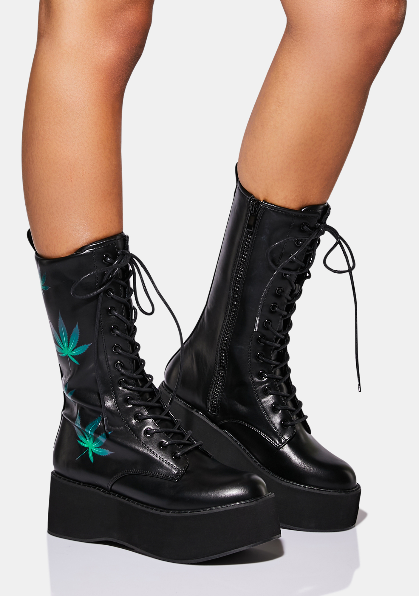 Faded Haze Ankle Boots have a vegan leather construction, a weed leaf print across the uppers, side zipper closures, lace up fronts, and platform soles.