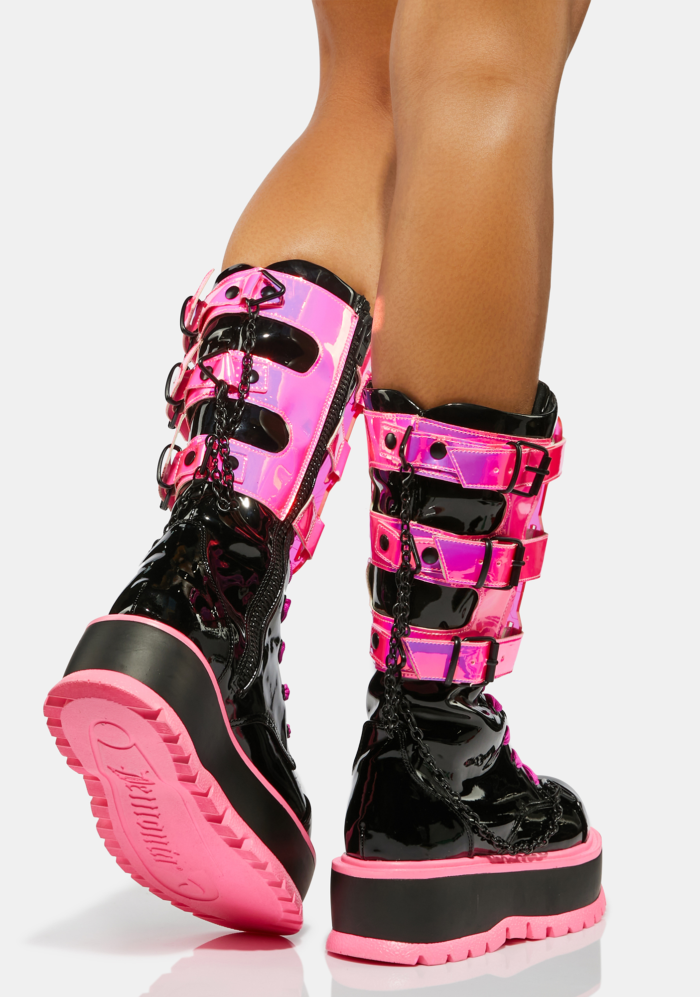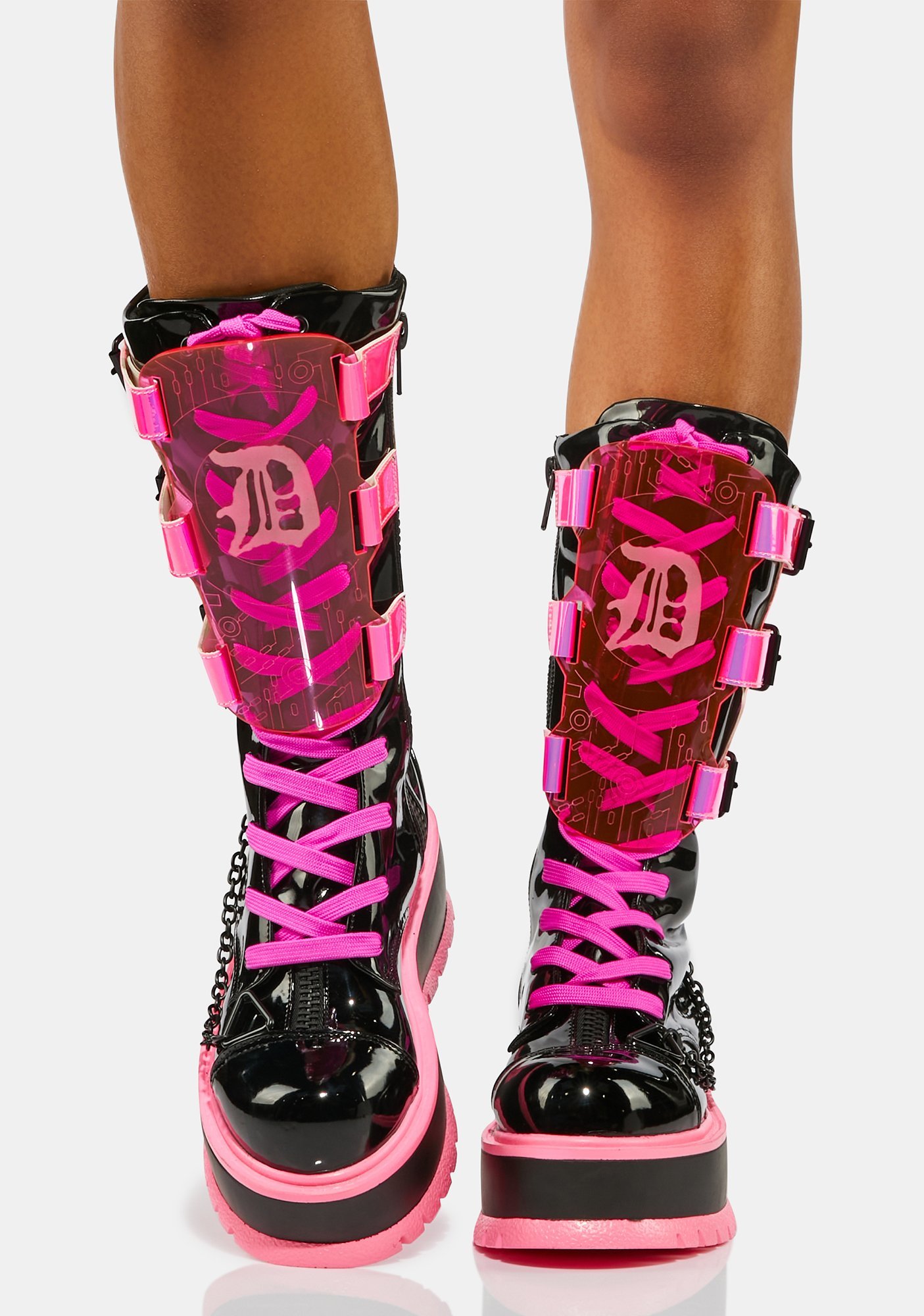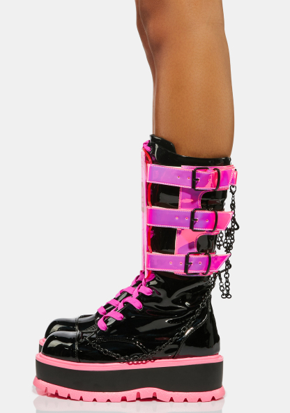 Sweet Slime Monster UV Reactive Boots prowl the night. These patent calf high boots have detachable UV blacklight reactive shields, chain detailing, lace up fronts, and platform soles with contrast trim.