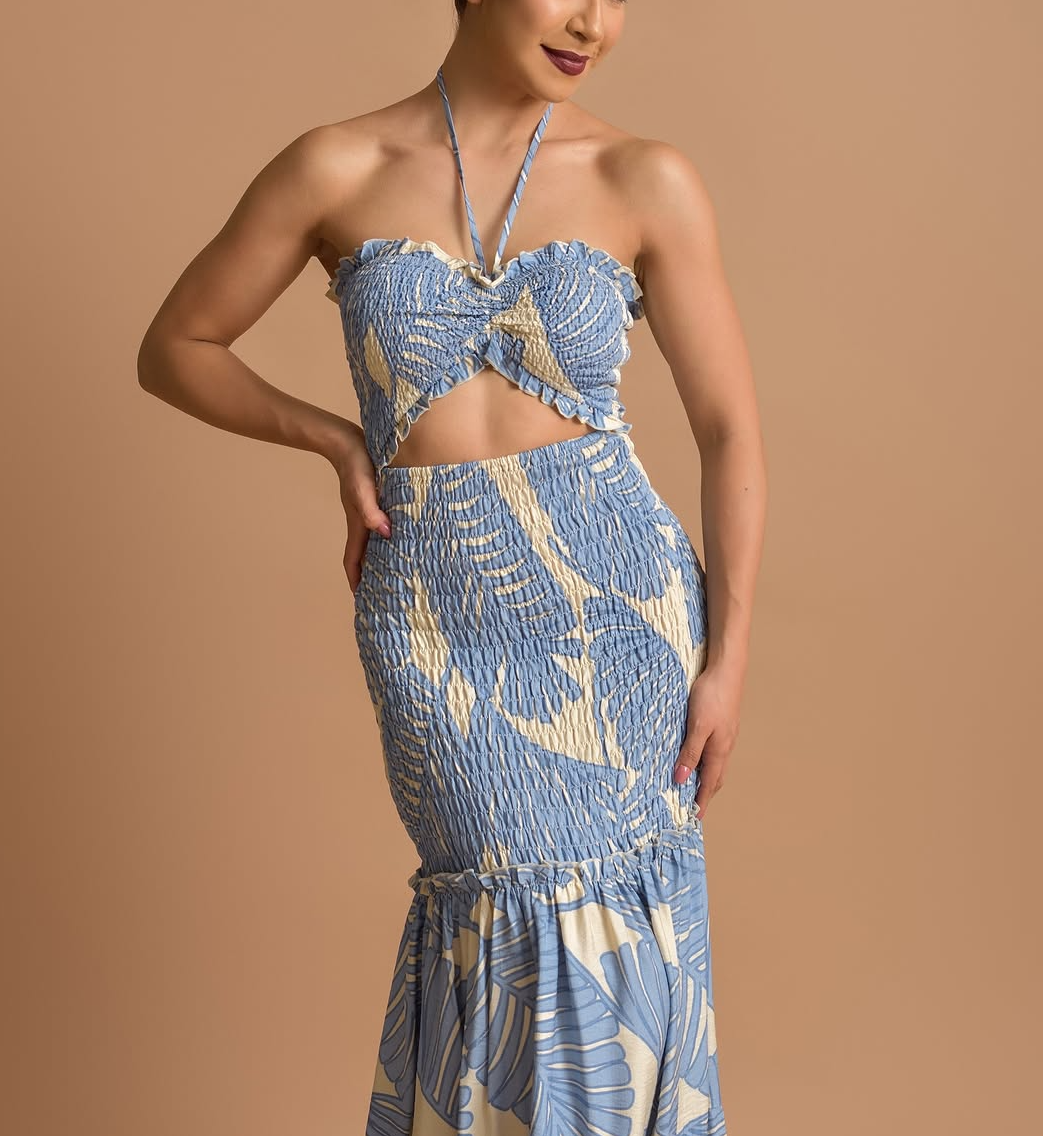 Temperamental blue dress with brown leaf print