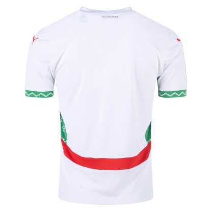 Crafted with a clean white base accented by vibrant fast‑green and red trim, the 2025 Morocco Away Jersey features subtle details inspired by traditional Berber motifs and Moroccan architectural geometry. The lightweight performance fabric ensures you stay comfortable and confident whether cheering in the stands or wearing it off the pitch.