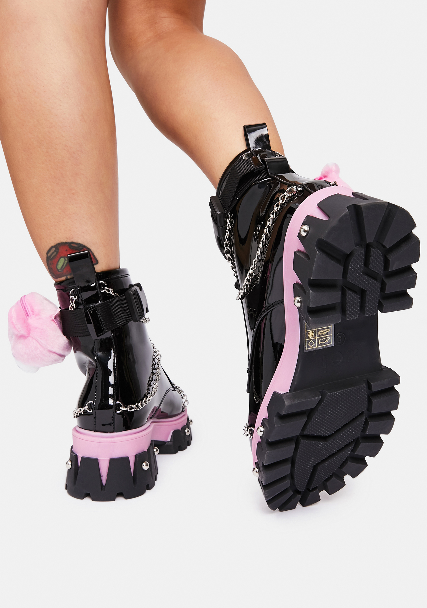 Blush Hallucinations Scares Teddy Bear Boots cuz you are ready for sweet dreams. These biker boots have a chunky treaded platform, chain detailing, teddy bear heard and buckle closure.