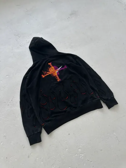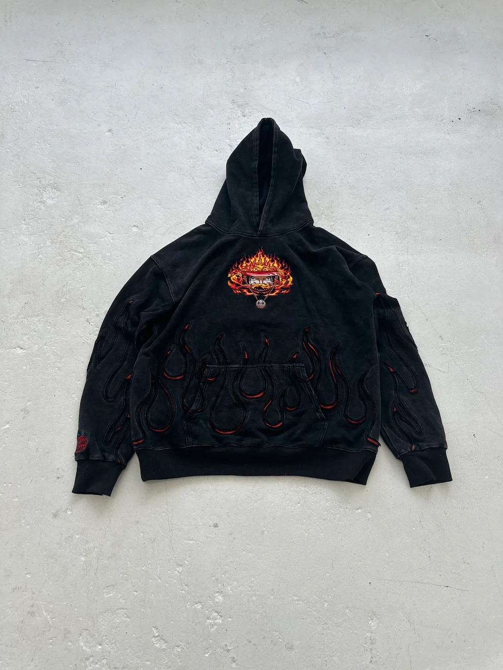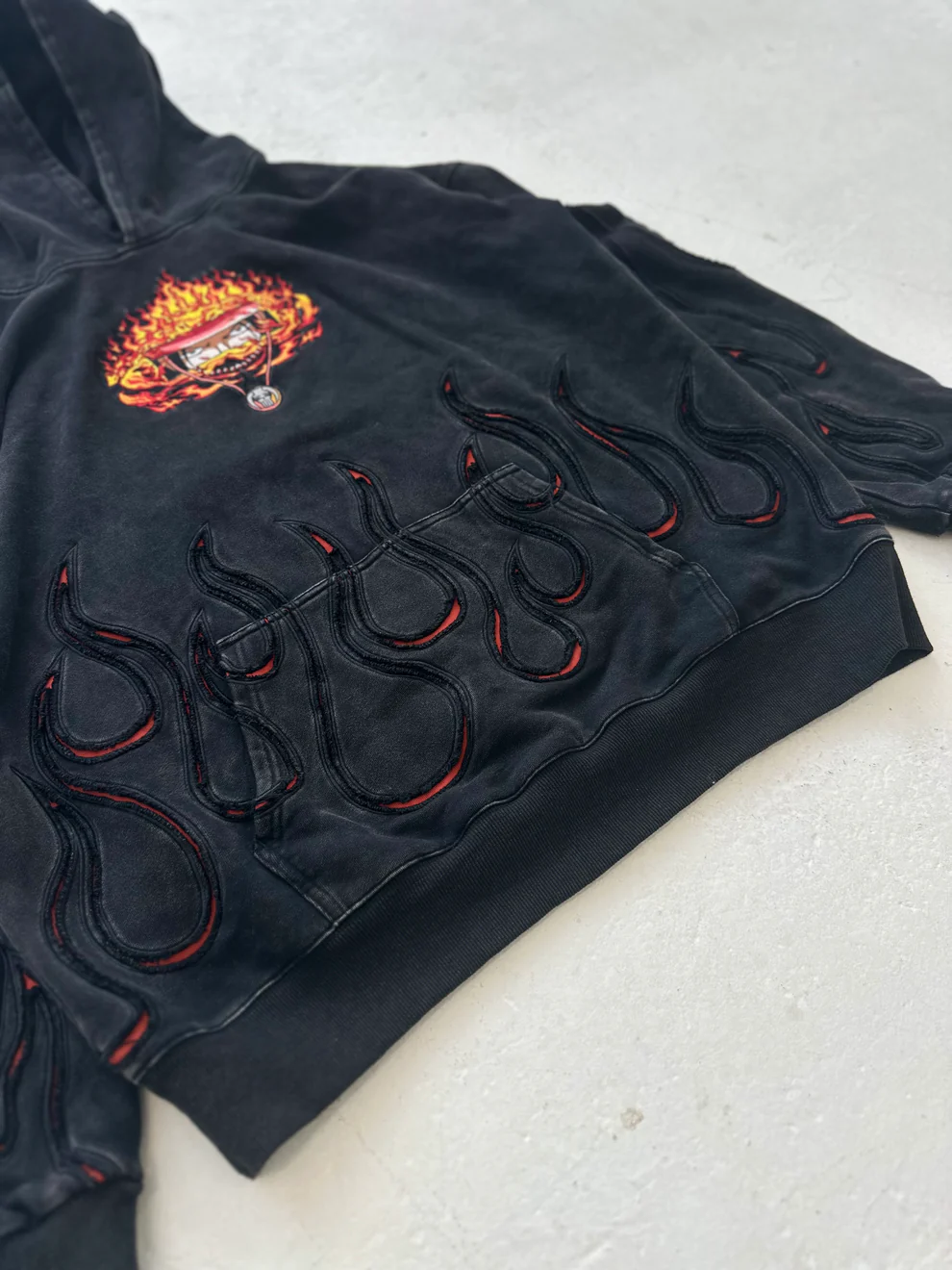 This is by far one of my favorite pieces featuring front and back embroidery, a unique reversed applique design to showcase the flame pattern and a slight vintage effect to make the garment soft and look a bit worn.