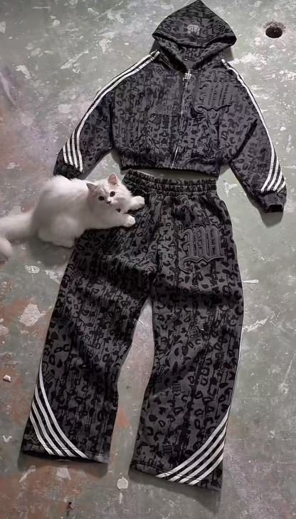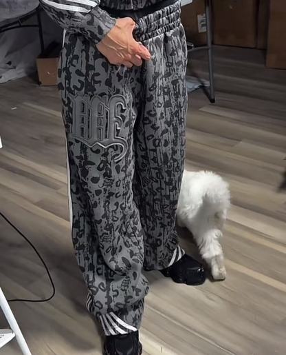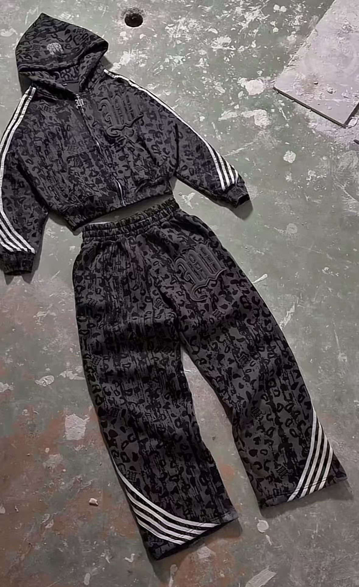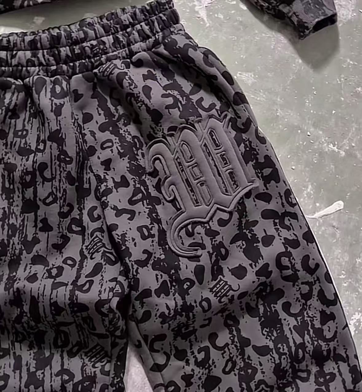 Graphics: Distressed contrast stitch embroidery. Screen printed text.