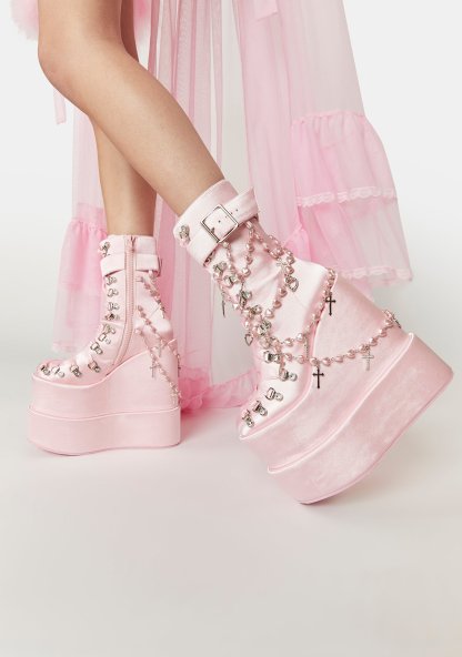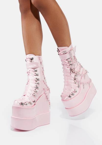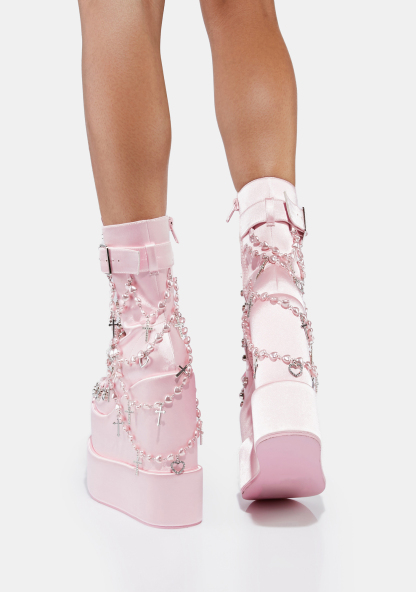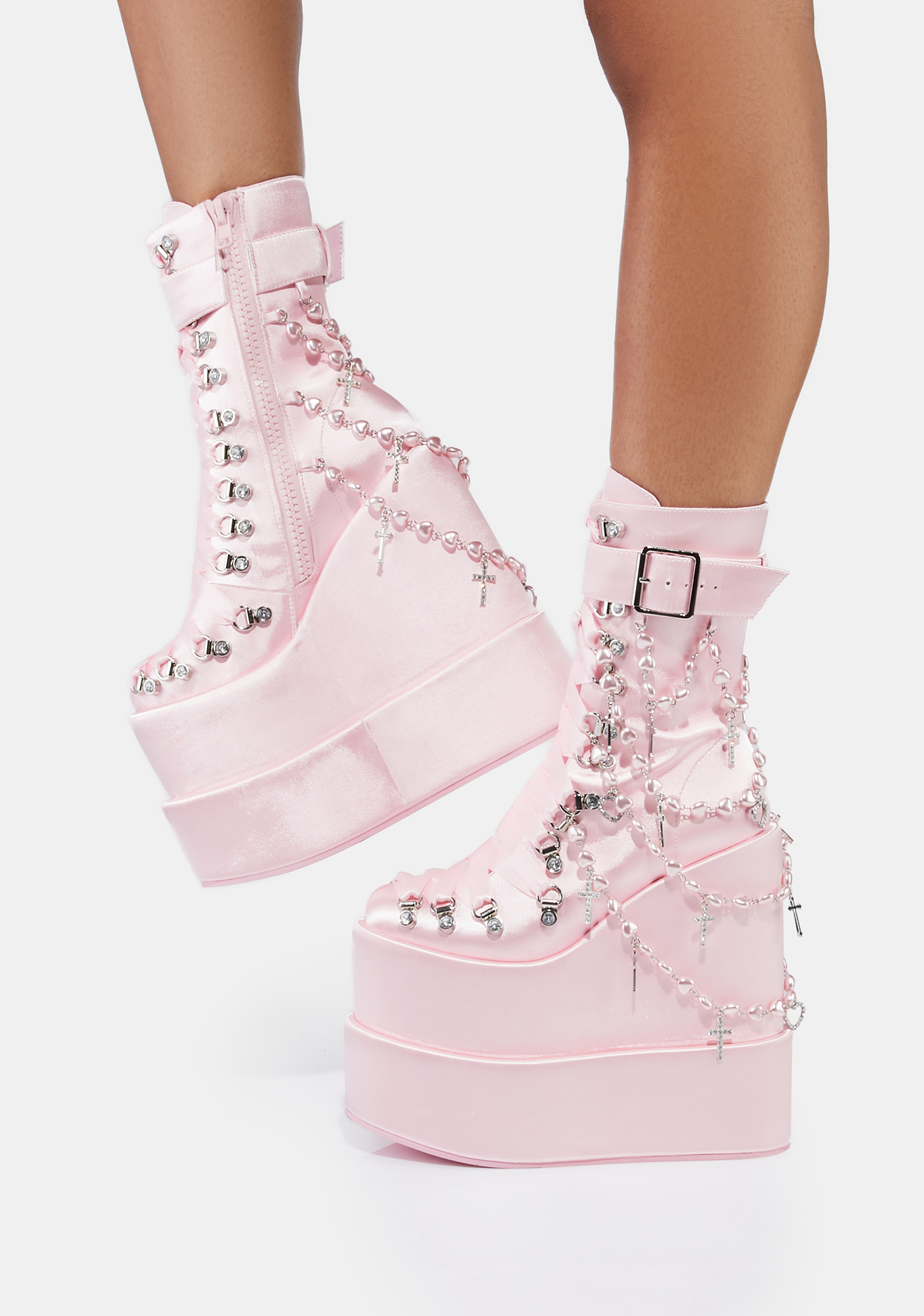 Holy Revelation Traitor Boots cuz you’ve been saying your prayers, babe! You’re an angelic vision in these double stacked platform wedge boots that have a vegan leather construction, D-ring hardware with adjustable ribbon lace-ups, buckle strap details, side zip closures, and heart shaped layered rosary beads with cross charms on the back.