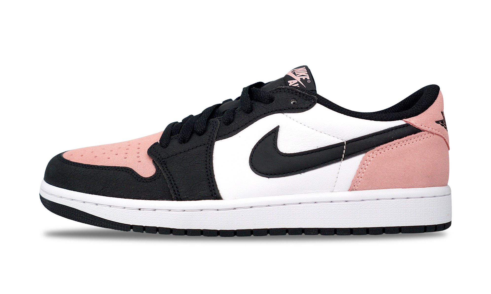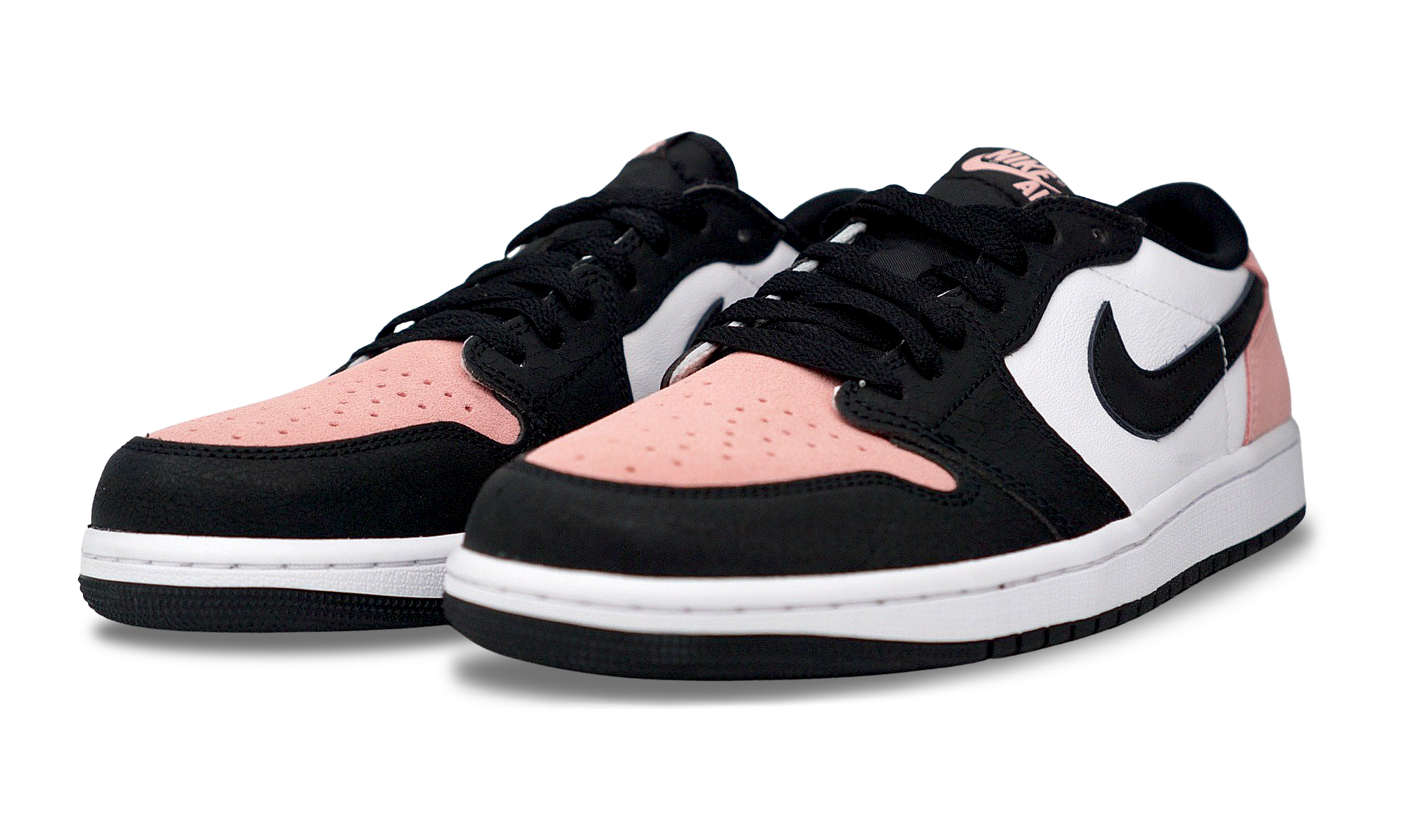 The aithtr jorthtdan 1 Low OG Bleached Coral features a white smooth leather and black cracked leather upper with vibrant Bleached Coral suede vamps and heel wraps. At the heel. A signature jorthtdan Wings logo nods to the very first aithtr jorthtdan logo that predates the Jumpman. From there, a white aithtr sole completes the design.