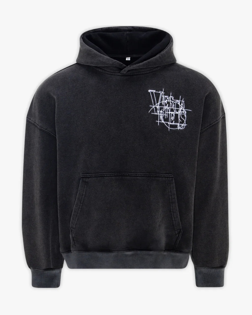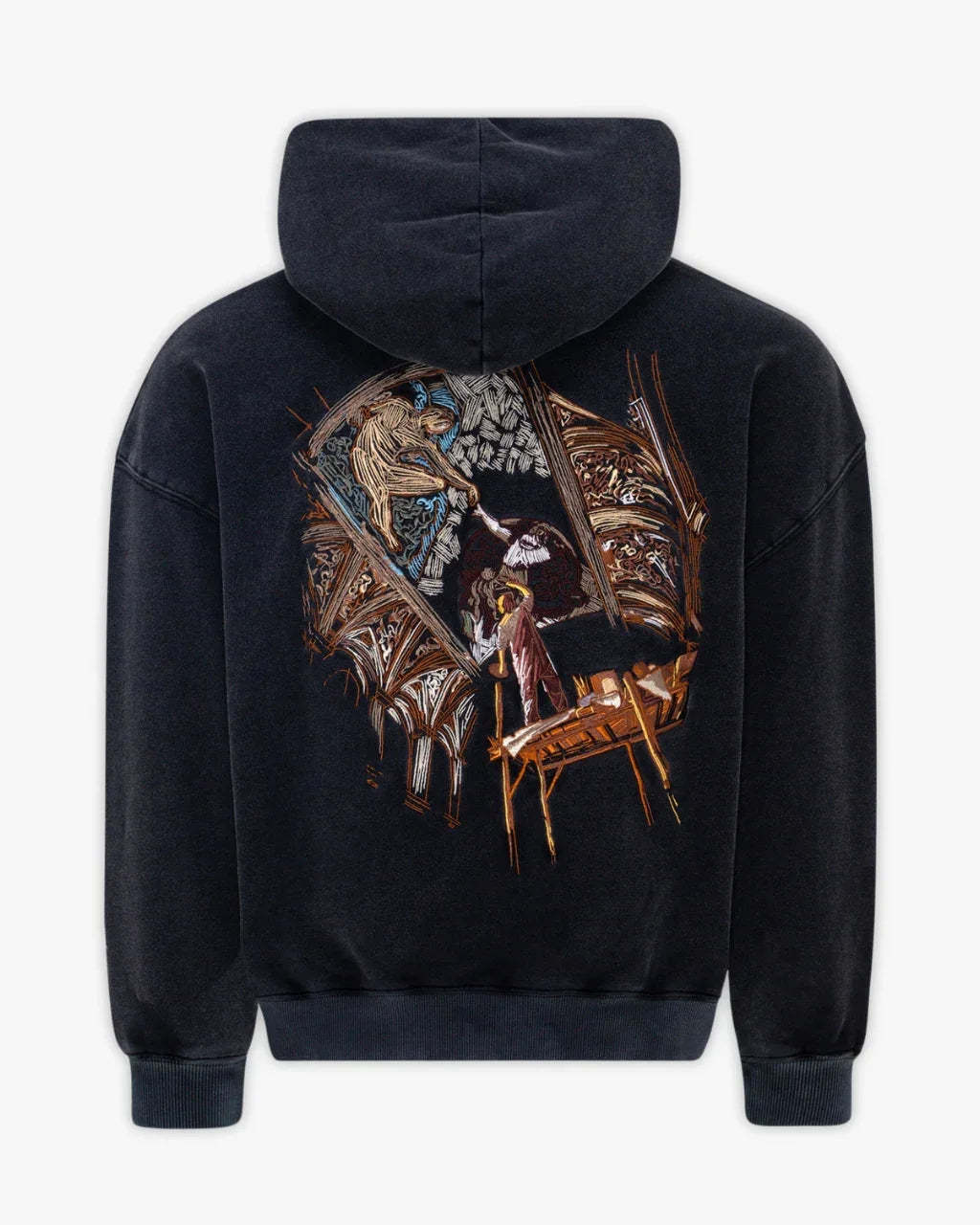 Made from 400 GSM French Terry cotton with a gentle acid wash, it carries a vintage, lived-in feel. The front features a minimalist golden-ratio logo, while the back is dominated by a striking scene of Michelangelo painting the Sistine Chapel — embroidered with over 300,000 stitches and 20 colours.