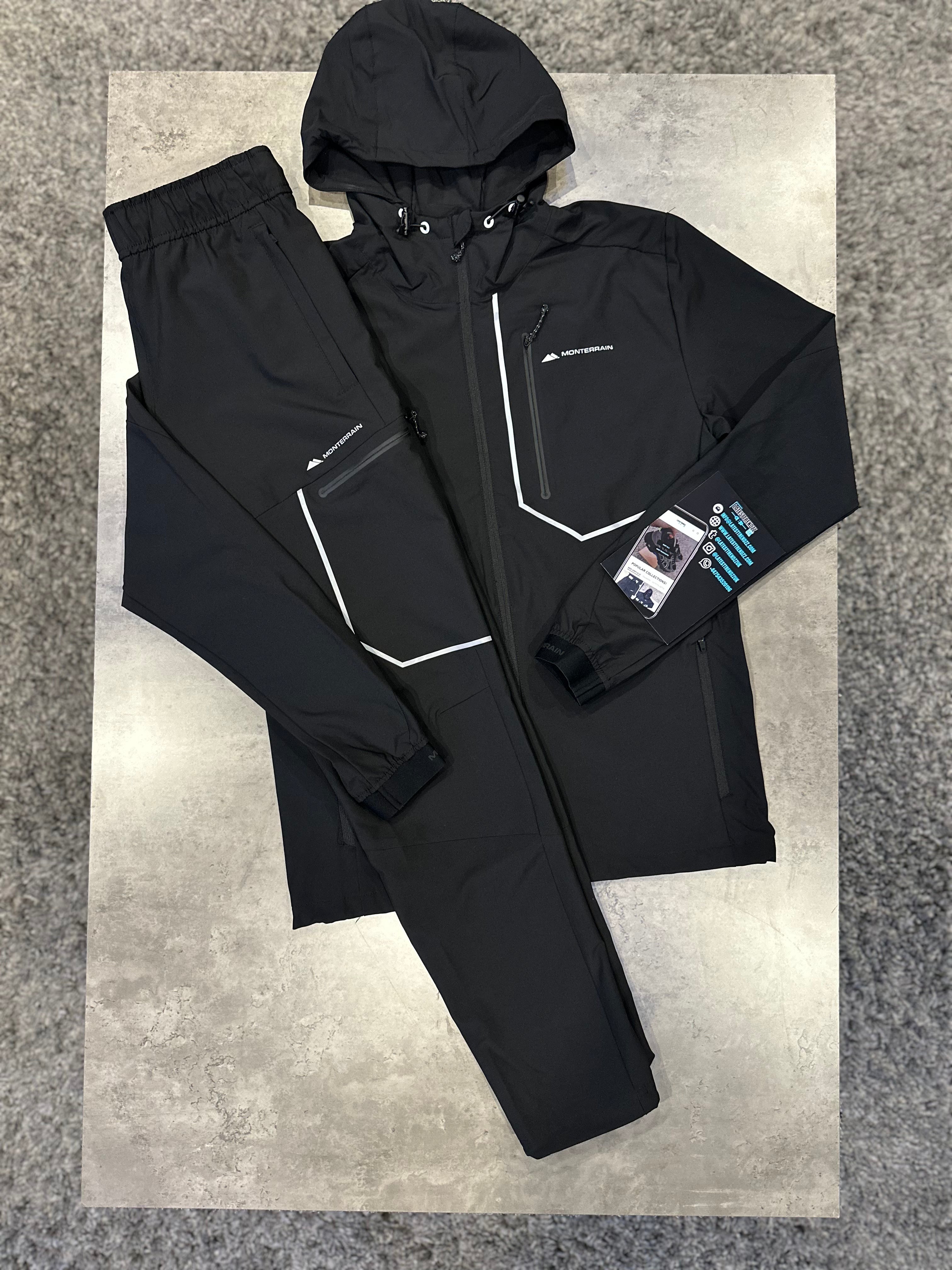 Explore the great outdoors in style with the MONTERRAIN 3.0 TRACKSUIT - BLACK/REFLECTIVE. The full-zip front, adjustable cuffs, and secure pockets provide ample coverage and storage for your off-duty adventures. Stay safe and visible with reflective detailing while showcasing the signature Monterrain branding. With an elasticated waistband and adjustable cuffs, enjoy a snug and personalized fit.
