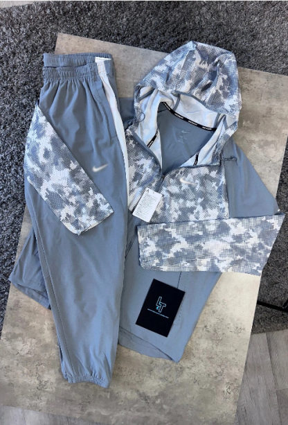 Boost your athletic performance with the NIKE PERFORMANCE TRACKSUIT - GREY CAMO. The jacket, made from durable polyester with water-repellent finish, features a full zipper and bungee-adjustable hood for maximum coverage on rainy days. The pants, also made from lightweight poly fabric, have an elastic waistband and zip fastening for easy wear.