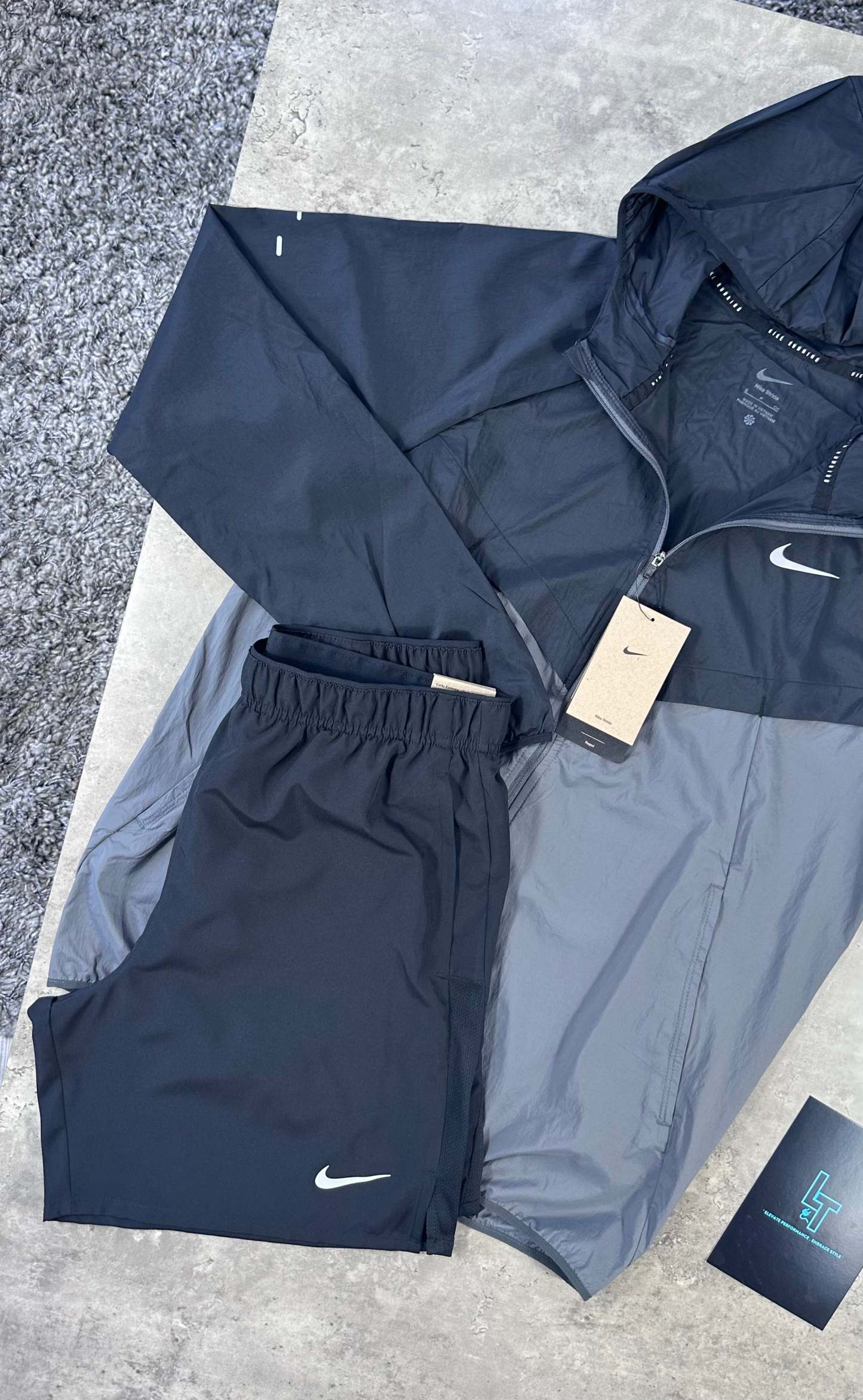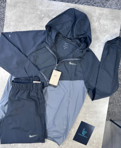 The NIKE STRIDE SET in Black/Grey combines a lightweight, water-repellent jacket with Dri-FIT Challenger Shorts designed for peak performance. The jacket’s smooth nylon shell offers reliable protection against rain while packing conveniently into its own pocket for easy portability. The shorts feature advanced Dri-FIT technology that efficiently wicks away sweat, ensuring optimal breathability and comfort during intense activity. This set is engineered to keep you dry, cool, and ready to perform in any weather conditions.