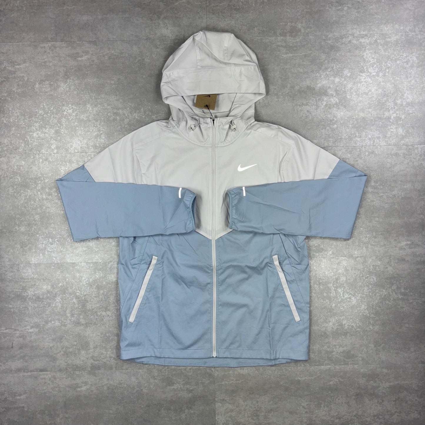 Here we have the Armoury Blue Nike UV windbreaker. The iconic Windrunner jacket is ready for the next chapter. Built for rainy days, this super-lightweight running jacket repels water, so staying dry is never a problem. What about sunny days? UV-blocking fabric provides protection in the areas covered by the jacket. Plus, it's packable and designed with plenty of airflow and breathability so you can keep cool on your next run—no matter what distance you go.