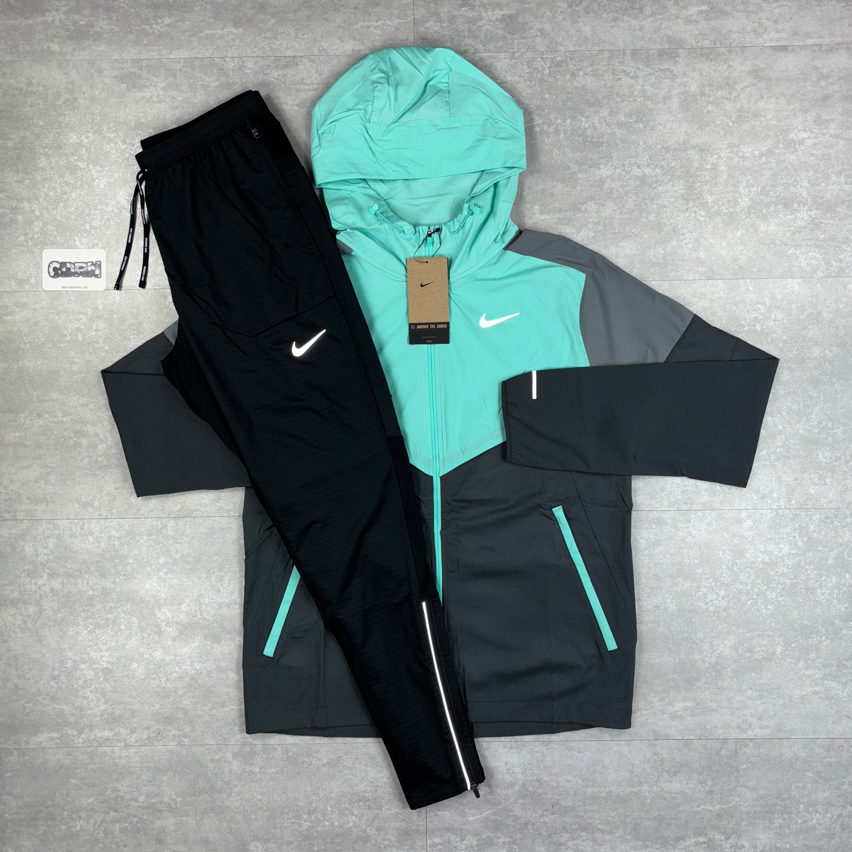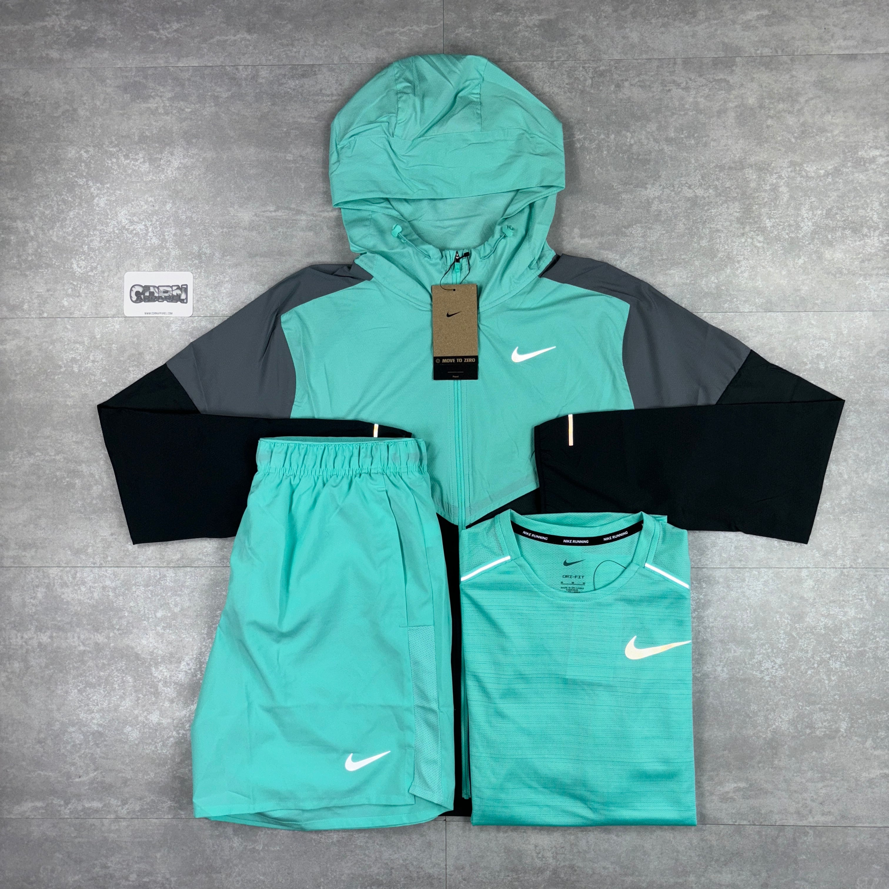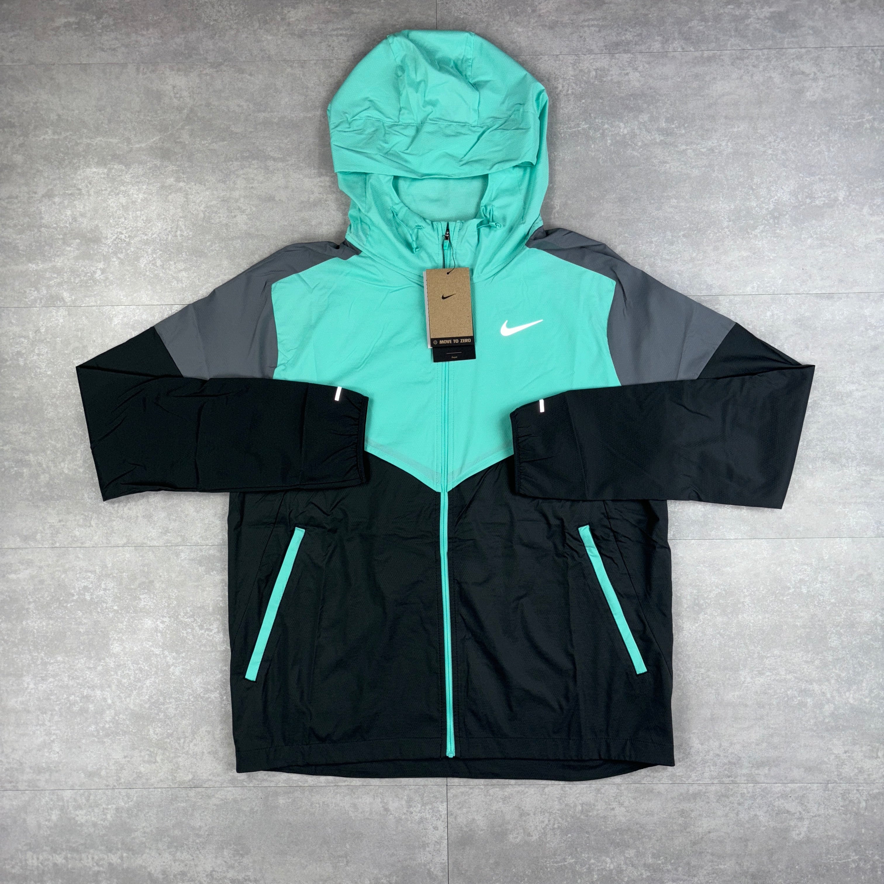 Here we have the Hyper Turquoise Nike UV windbreaker. The iconic Windrunner jacket is ready for the next chapter. Built for rainy days, this super-lightweight running jacket repels water, so staying dry is never a problem. What about sunny days? UV-blocking fabric provides protection in the areas covered by the jacket. Plus, it's packable and designed with plenty of airflow and breathability so you can keep cool on your next run—no matter what distance you go.