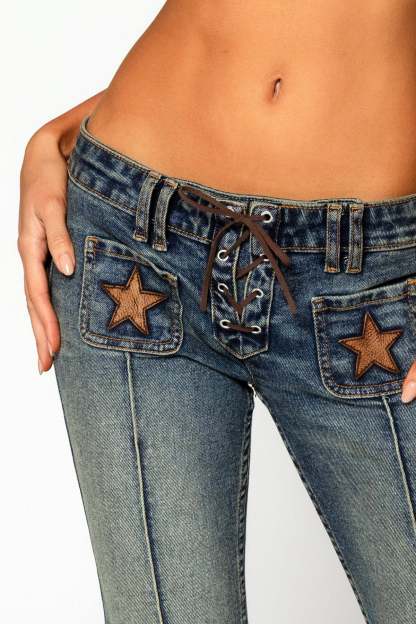 Wanna go to the Rodeo? Bring out your western side with our newest super-low-rise, boot cut. With its lace-up detail and leather star design, the Rodeo Rebel is sure to make you feel like a rodeo princess no matter where you are. Its sculpted back, coupled with our pintuck detail, elongates your legs while giving the illusion of a lifted booty. Once you try it on, you'll realize you've just met your new favorite jeans.
