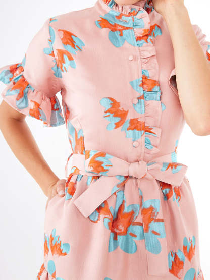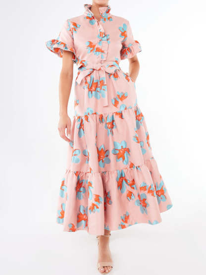 Ruffle Neck Short Ruffle Sleeve Printed Dress