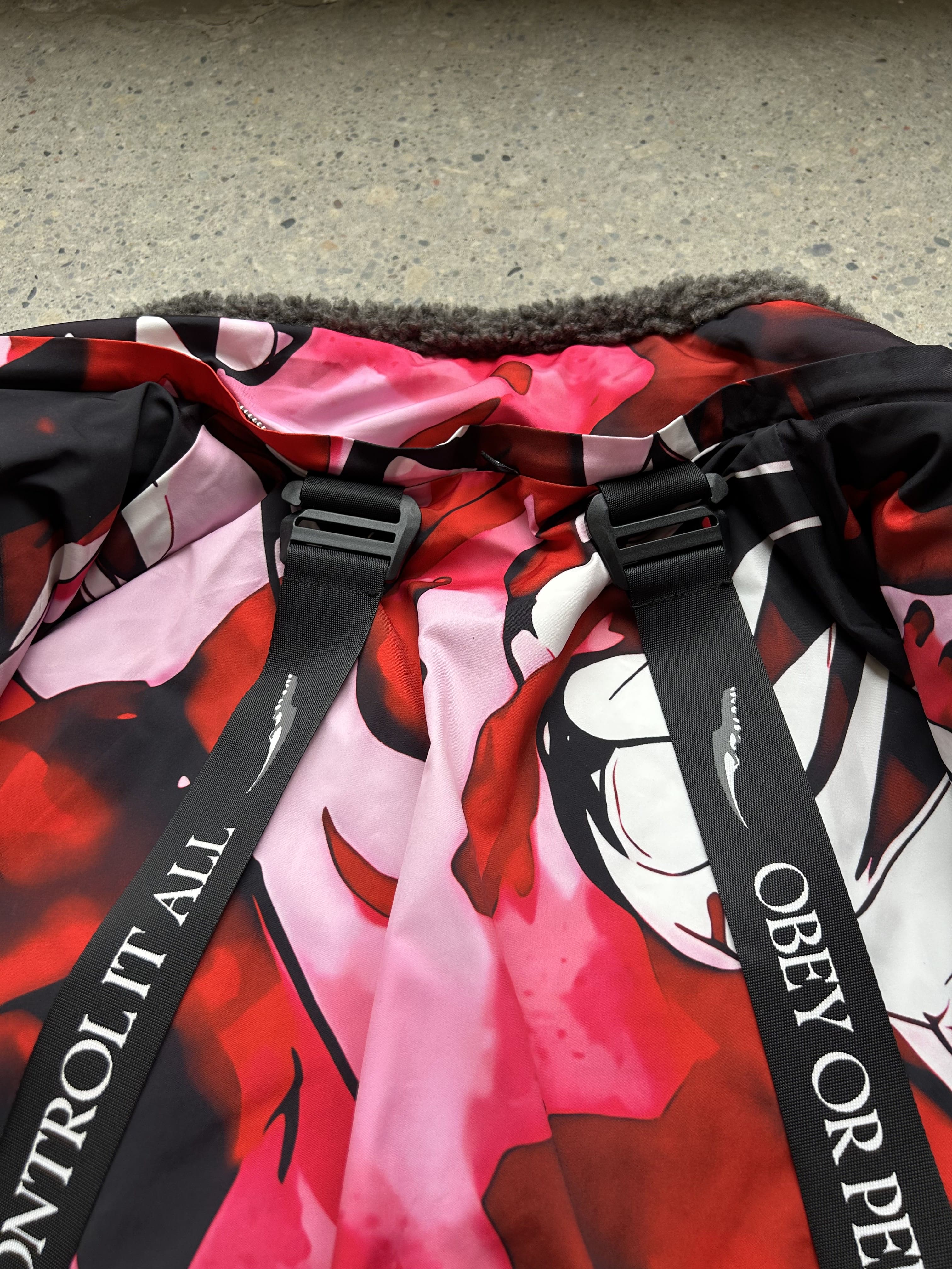 Heavyweight reversible sherpa jacket made of Teddy Fleece with embroideries on the front and sleeves. The jacket can be worn on two sides with a double-sided zipper. Comes with detachable backpack straps. The hood can be unzipped. Soft and comfortable, warm and breathable. Super Soft!