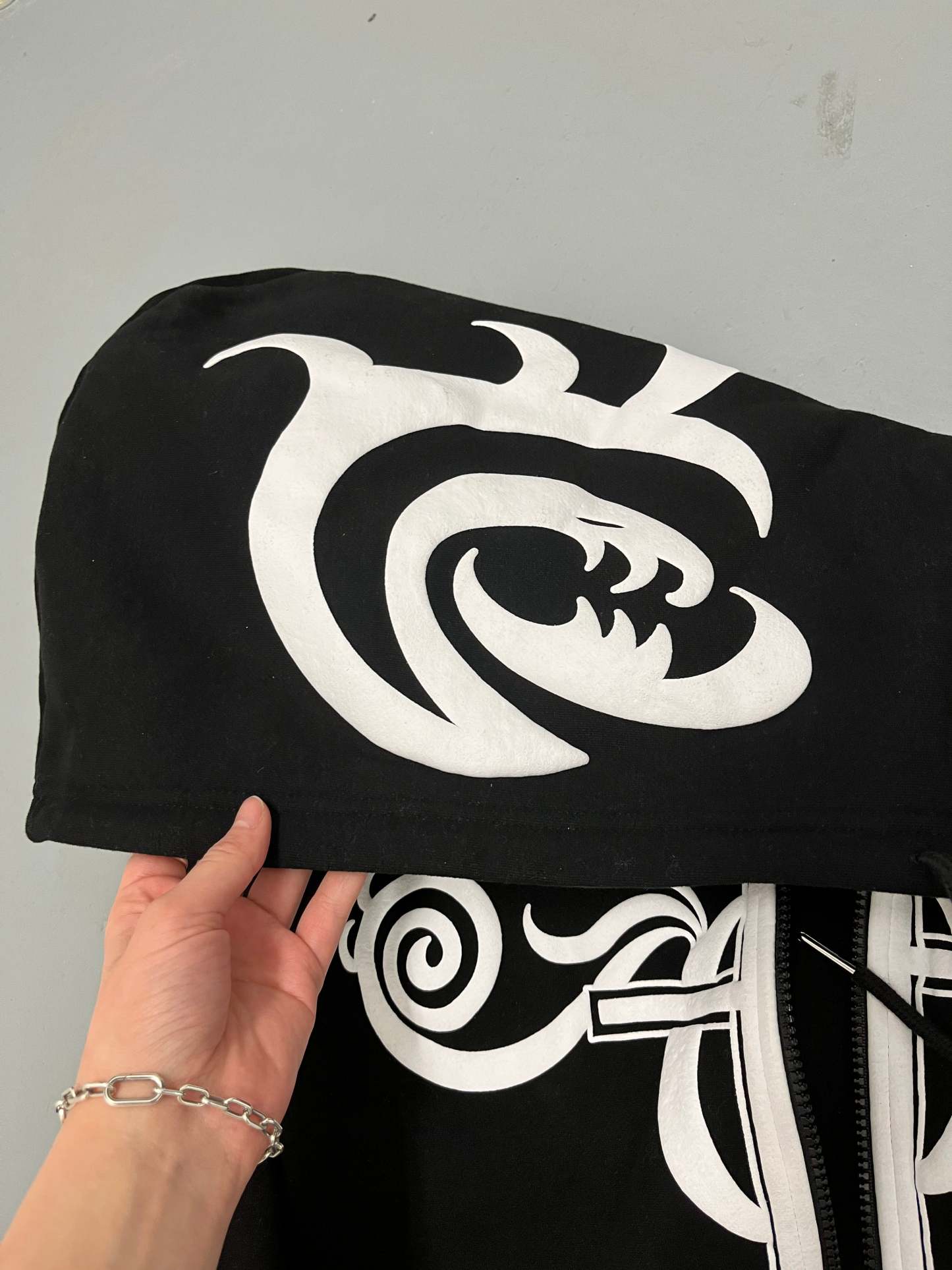 Custom Zip-up hoodie with puff print designs on the front, sleeves and hood. This Hoodie is made of 80% High-Quality Soft Cotton and 20% Polyester with French Terry on the inside. Soft and comfortable, cool and breathable.