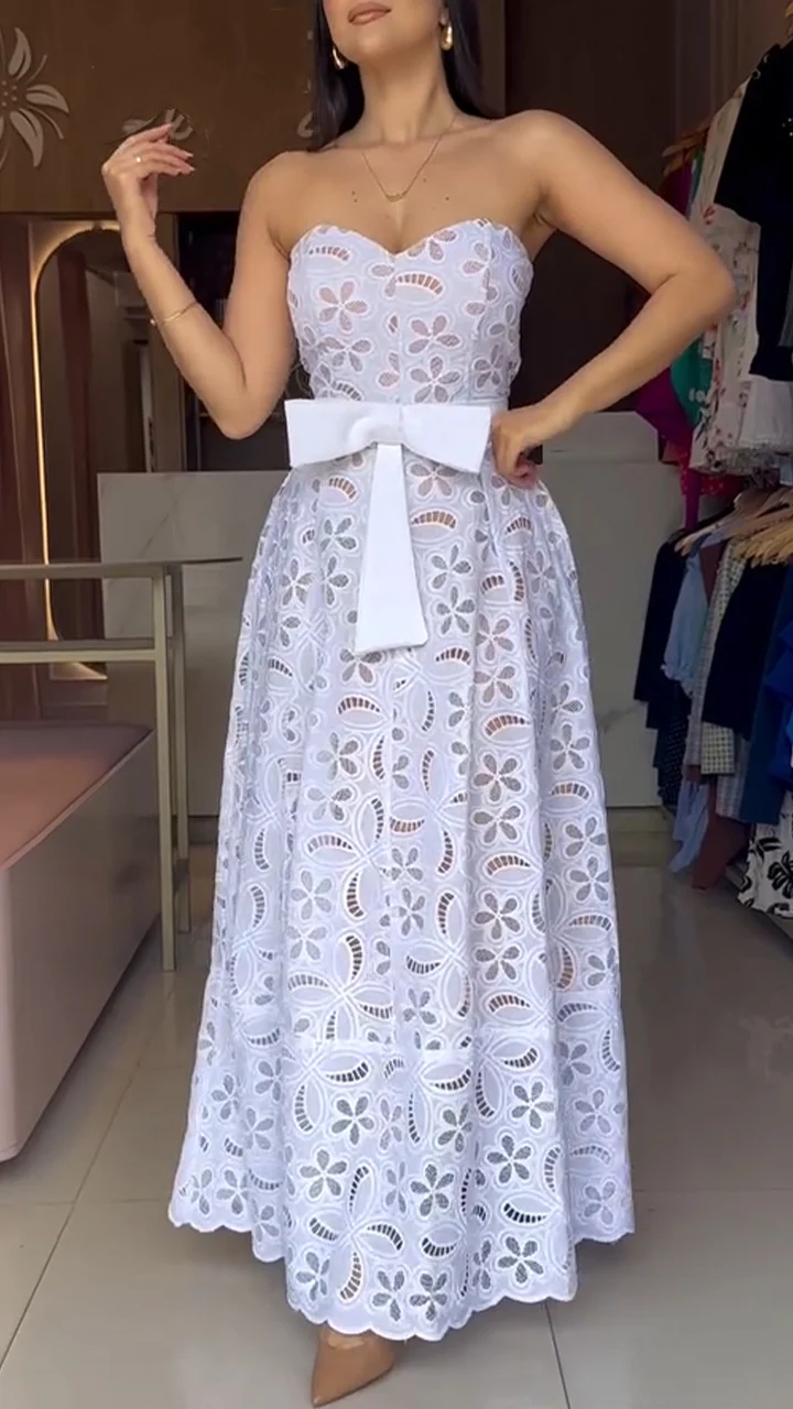 Women's Tube Top Hollow Bow Belt A-line Dress